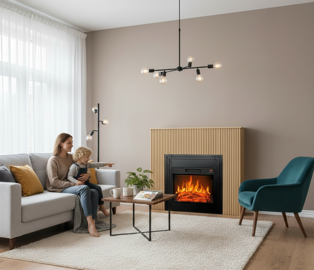 Accueil ⟶ Camino elettrico da appoggio AMBRA – Effetto fiamme LED – Listelli di legno ⟶ Cheminée électrique Chemin’Arte Ambra ambiance 2