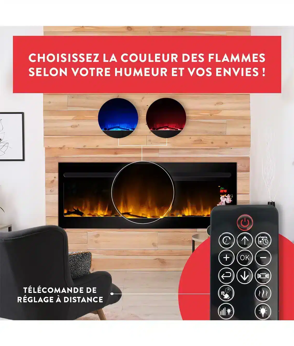 Gérez votre cheminée en toute simplicité avec la télécommande incluse ou en wifi via notre application mobile (Wifi disponible Selon le modèle). Ajustez l’intensité des flammes, la température, et même le timer d’arrêt sans bouger de votre canapé. Que ce soit pour créer une ambiance chaleureuse ou régler la chaleur de la pièce, tout est à portée de main pour un confort sur mesure, au quotidien.