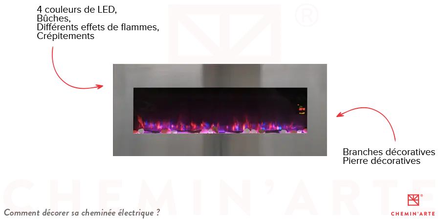 Les effets de flammes peuvent être plus ou moins réalistes selon votre désir. Ils apportent un élément d’ornement supplémentaire à votre chez-vous. Les différents accessoires disponibles pour décorer votre cheminée électrique sont indispensables pour modifier subtilement votre ambiance : des pierres, des bûches, mais aussi des imitations de crépitements. Chacun de ces éléments d’enjolivement peut instaurer une atmosphère spéciale et agréable dans votre logis. Enfin, les couleurs, les solutions intelligentes, mais aussi le style de votre cheminée électrique sont des critères de choix. Or, dès son achat, vous pourrez décider de la meilleure décoration pour votre cheminée électrique à adopter pour votre habitation et de la manière dont vous souhaitez ornementer cette dernière, ainsi que votre cheminée électrique.