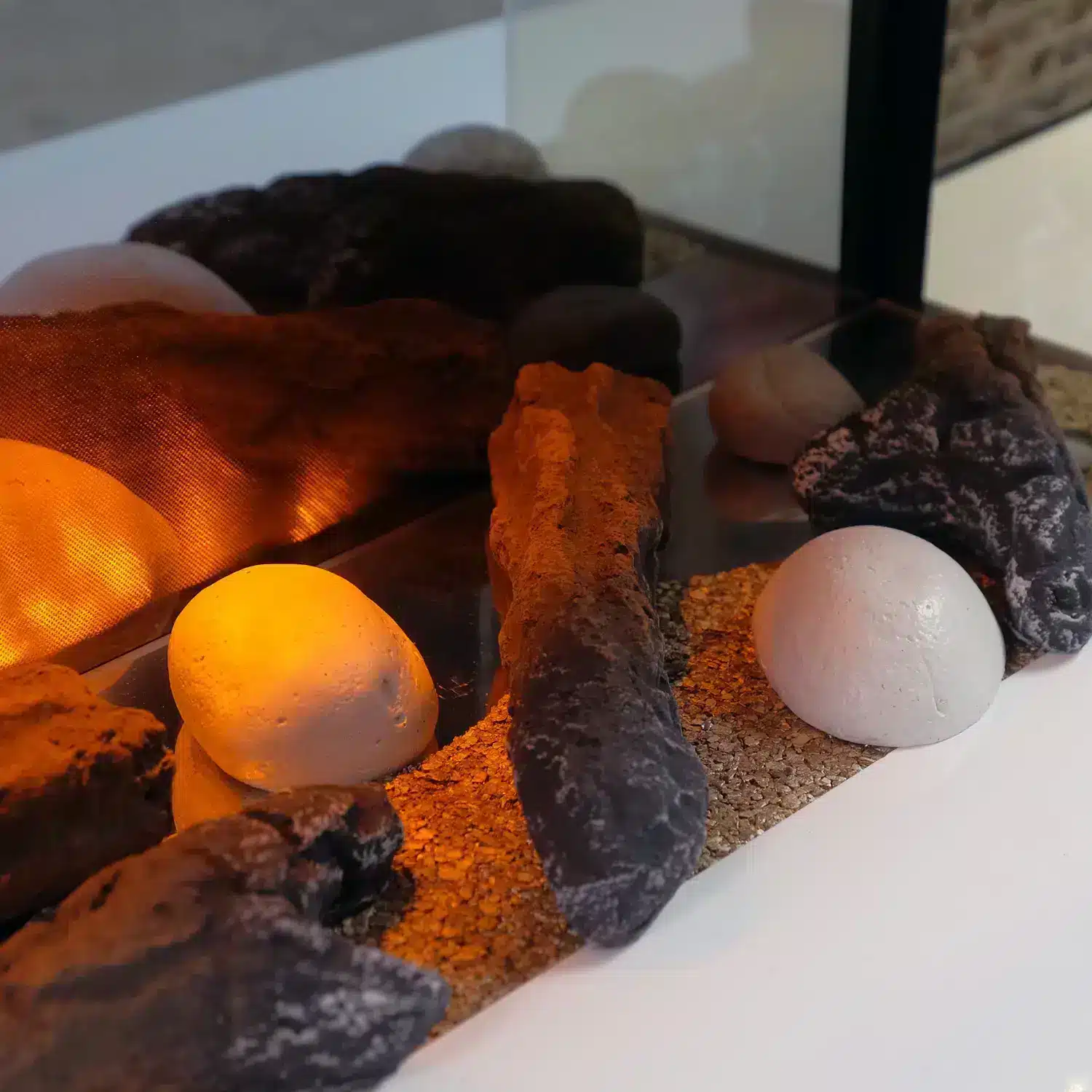 Optionale Deko-Accessoires: zusätzliche Holzscheite, rote Kristalle usw.