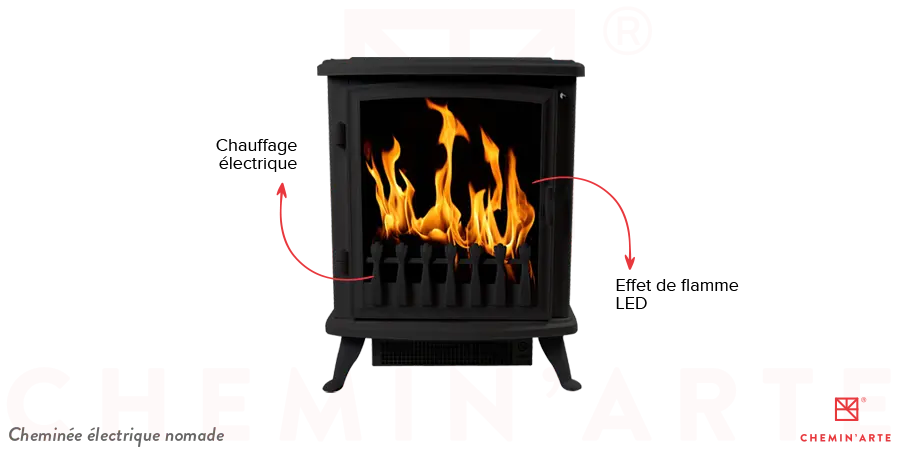 Der nomadische elektrische Kamin wird mit einer elektrischen Heizung betrieben. Die Wärme wird durch einen Wärmekonvektor erzeugt, der kalte Luft in warme Luft umwandelt, wenn sie durch den elektrischen Widerstand strömt. Ein Ventilator sorgt dann dafür, dass es in Ihrem Raum verteilt wird, wobei sich die Wärme im ganzen Raum verteilt. Die Heizleistung eines mobilen Elektrokamins ist leistungsstark und reicht in der Regel von 1 000 bis 2 000 W, was für einen Raum von mehr als 30 m² ausreichend ist. Natürlich wird in einem Elektrokamin kein echtes Feuer entzündet, er funktioniert zu 100 % elektrisch.