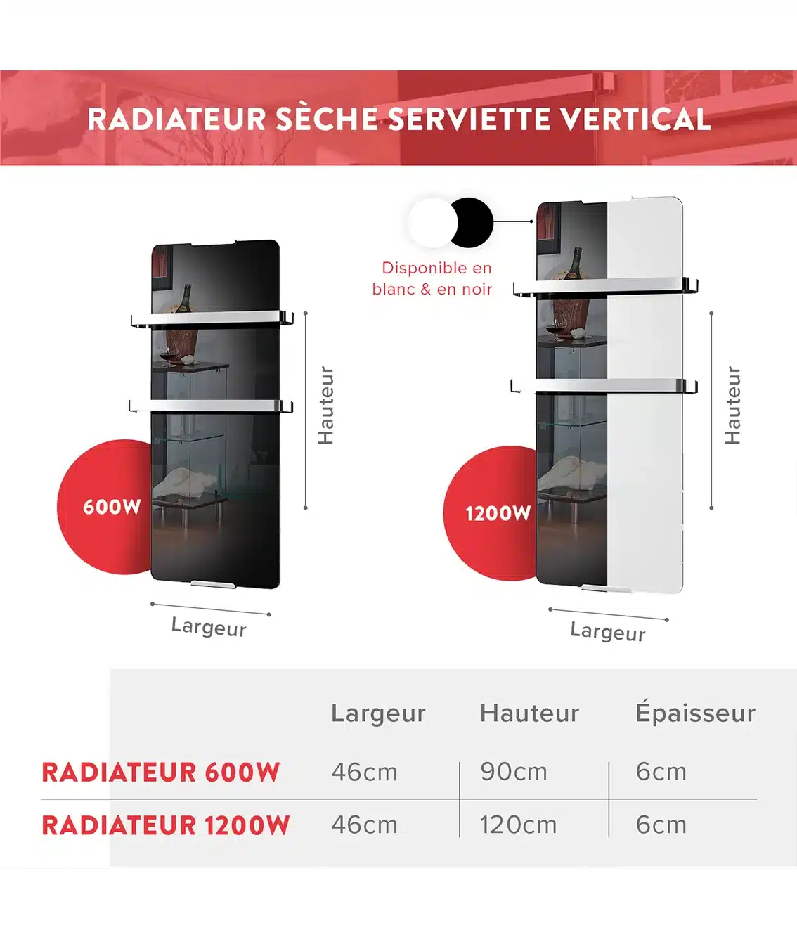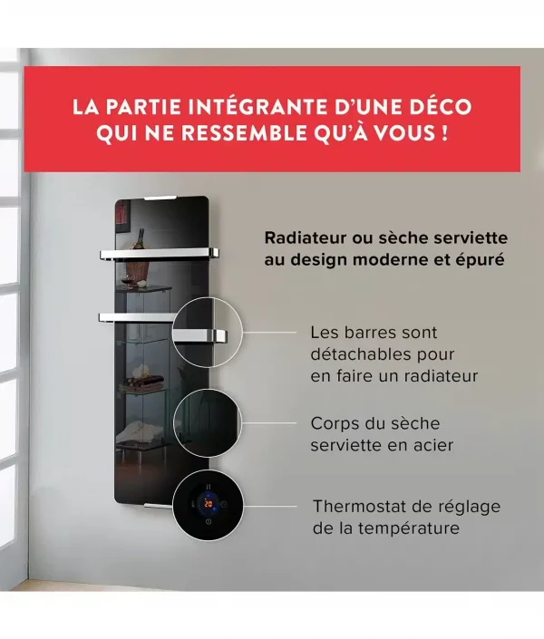 Unser Heizkörper hat eine doppelte Funktionalität: Sie können ihn als vertikalen Design-Heizkörper verwenden oder mit den passenden Stäben als Handtuchheizkörper. Das moderne, schlichte Design passt in jeden Raum und passt zu jeder Einrichtung. Dieser schlichte und elegante Heizkörper ist nicht weniger leistungsstark: Mit ihm können Sie einen Raum von 15M2 perfekt beheizen. Dieser Heizkörper ist wartungsfrei: Er erzeugt weder Rauch, noch Staub oder Gerüche. In nur wenigen Minuten können Sie es installieren. Er wurde so konzipiert, dass er in Ihr Badezimmer passt und entspricht der IP24-Norm. Sein einstellbarer Thermostat sorgt dafür, dass Sie den ganzen Tag über die ideale Wärme genießen können. Und schließlich seine Aluminiumbeständigkeit