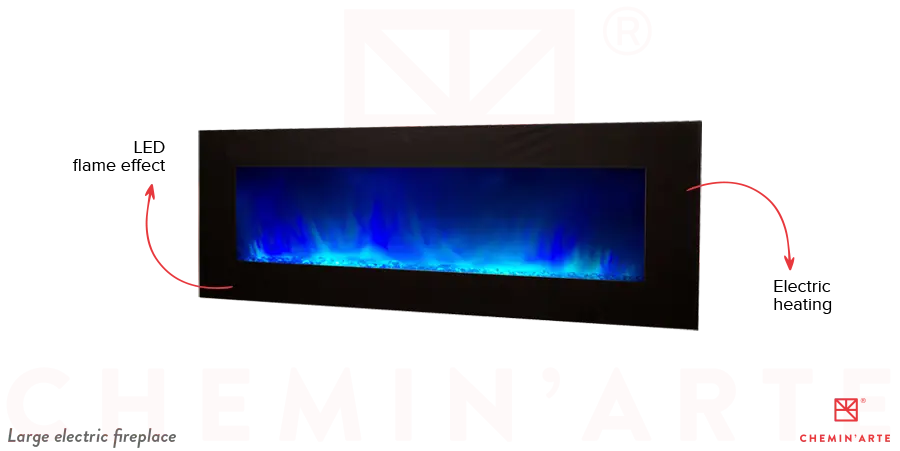 A large electric fireplace operates with an electric heating system and visually reproduces the appearance of a traditional fireplace. The heating power is efficient and requires less maintenance than a gas or wood fireplace, while consuming less. The biggest advantage of a large electric fireplace is its design aspect: it dresses up a room and gives it a warm and comfortable atmosphere. The flame effects, the fireplace cladding and the accessories available allow the appearance of a classic fireplace to be reproduced to perfection, and the atmosphere it creates.