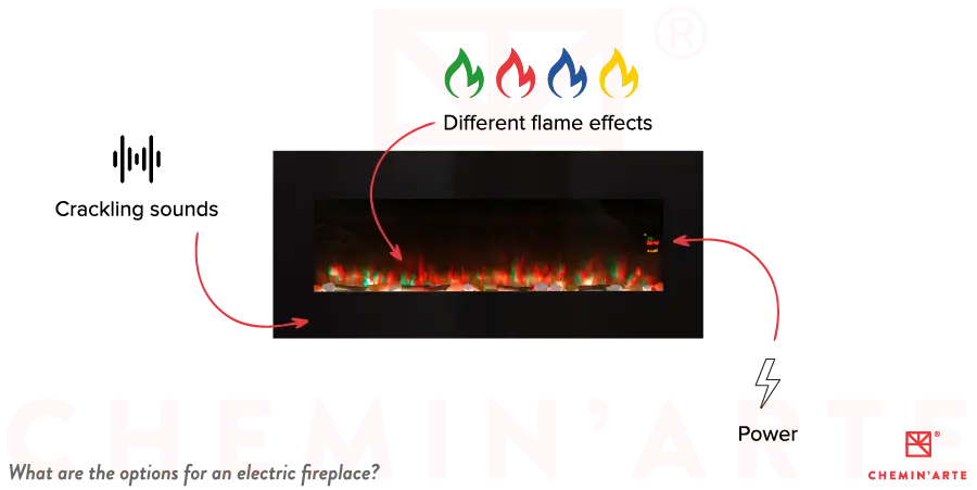 Electric fireplace options are divided into 5 categories: flames, accessories, colors, styles and connected solutions. Some electric fireplaces offer options not available on other models, depending on your needs and desires.