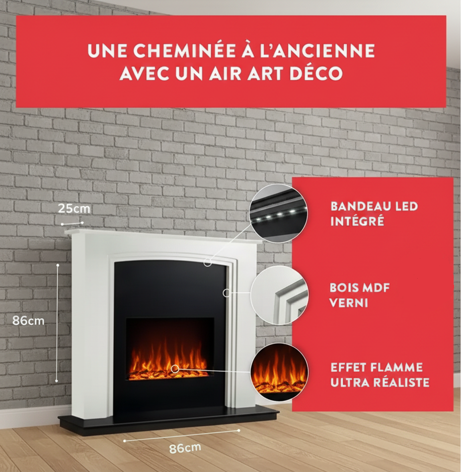 Scegli un design moderno e raffinato con il camino elettrico da appoggio Manhattan Chemin’Arte. Il suo stile lineare, arricchito da bande LED integrate, crea un’atmosfera calda e accogliente. Grazie all’effetto fiamma ultra realistico e ai ciottoli decorativi, offre l’illusione perfetta di un vero camino, senza fumo né manutenzione. Potente e sicuro, riscalda ambienti fino a 30 m², restando freddo al tatto. Facile da installare, viene fornito già assemblato, pronto per l’uso immediato.