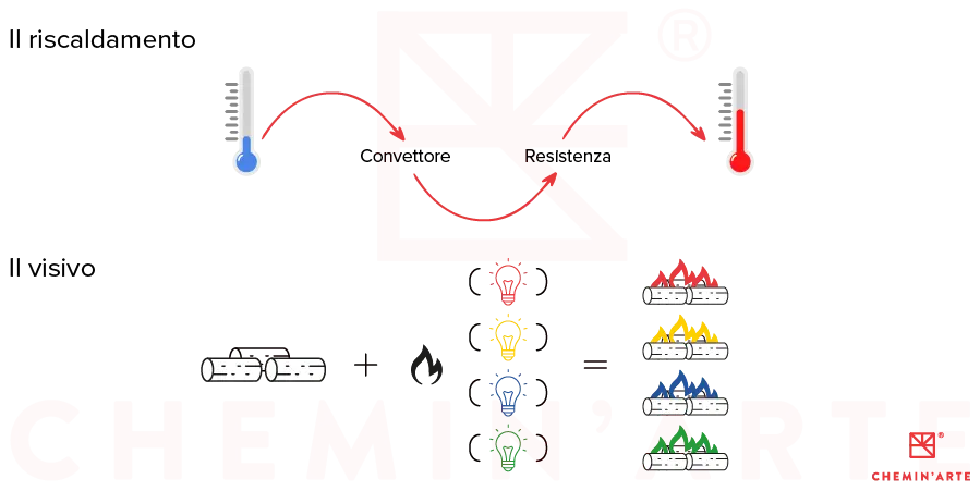 Il caminetto elettrico è riscaldato da un convettore elettrico installato direttamente all’interno del caminetto. Il convettore è alimentato da un elemento elettrico riscaldato. Quando entra in contatto con l’aria, si riscalda per effetto Joule. In parole povere, l’aria fredda entra nella parte inferiore del convettore e passa attraverso l’elemento riscaldante, prima di uscire attraverso l’uscita superiore.