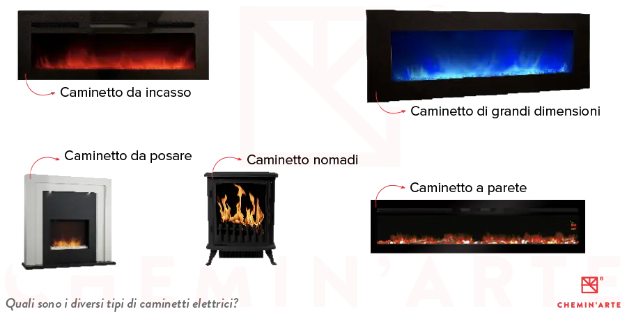I diversi tipi di caminetti elettrici disponibili da Chemin'Arte sono: a libera installazione, a incasso, grandi, a parete e nomadi. Tutti questi caminetti elettrici hanno i loro vantaggi e troverete sicuramente quello che fa per voi.