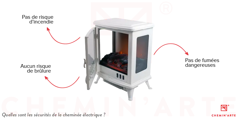 Une cheminée électrique, contrairement à un foyer traditionnel, ne loge ni feu, ni bois, ni cendre, ni fumée. Aucun risque d’incendie n’est possible. Les effets de flammes sont à but décoratif, et sont réalisés par des LEDs, il n’est donc pas possible d’allumer un vrai feu. La chaleur s’échappe de l’appareil, notamment grâce à un ventilateur diffusant l’air chaud. Autrement dit, la vitre et l’habillage de la cheminée électrique ne sont pas brûlants. La cheminée électrique ne peut par conséquent pas être à l’origine d’un incendie.